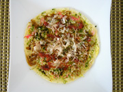 - 裏返して中まで火が通ったら皿に盛り、ソース・マヨネーズをぬり、かつお節・青のり・紅しょうがを飾る。