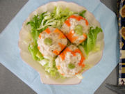 - 2のにんじんを十文字に置き、水溶き片栗粉をつける。3のタネをのせ、にんじんで包むよ うに丸める。中心に枝豆を1粒のせる。