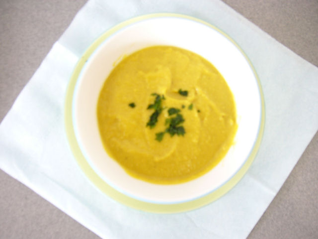 - 4を鍋に戻し、豆乳を加えて温め、塩・こしょうで味を整える。