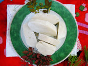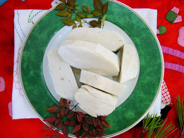 - うすときねでよくつき込み、棒状に丸め斜めに薄く切る。